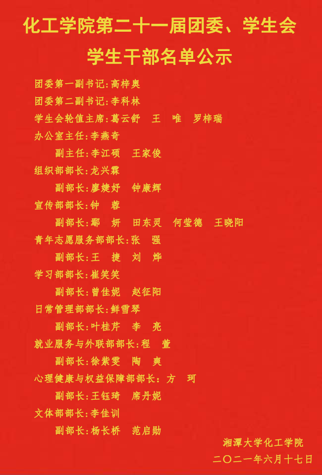 bevictor伟德官网第二十一届团委、学生会主要学生干部换届选举工作已如期圆满完成,现将换届选举结果汇报如下: