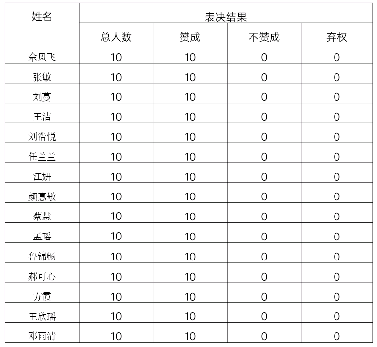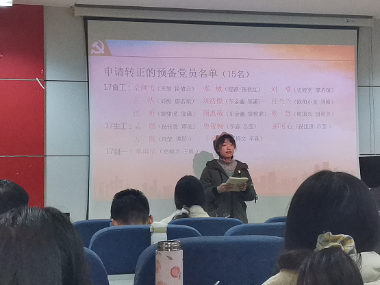 史姣雯宣布转正会议正式开始后,预备党员依次上台汇报自己的转正申请,包括预备期的表现、优缺点及今后的努力方向。汇报结束后,由各预备党员的两位转正介绍人宣读转正意见,与会其它党员对该名预备党员的情况进行提问并发表自己的意见。大家踊跃发言,场面庄重而热烈,愉快而温馨。随后,正式党员对预备党员是否按期转正进行讨论,最后由史姣雯同志宣读支部大会决议,现将表决结果公布如下: