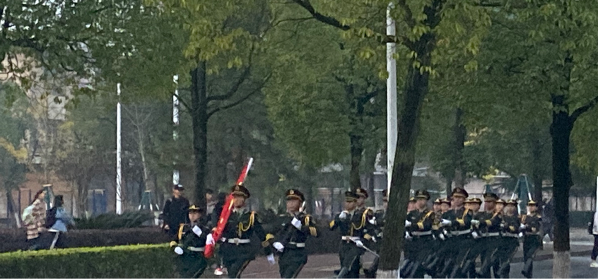 一切准备就绪,升旗仪式正式开始。首先,在全体师生的注目礼下,英姿飒爽的国旗护卫队队员们迈着庄严而整齐的步伐护送鲜艳的五星红旗进场。