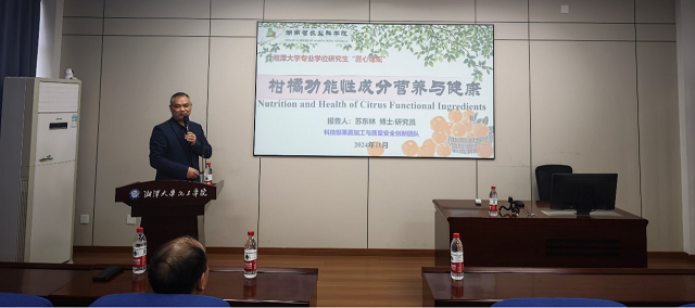 为推进专业学位人才培养质量的不断提升,拓宽研究生对行业领域的认知视野,提升职业素养,2024年12月3日下午3点,bevictor伟德官网,韦德官方网站,韦德bevictor体育特邀湖南省农产品加工研究所副所长、湖南省食品测试分析中心副主任苏东林做客“专业学位研究生匠心论坛”,作题为“柑橘功能性成分营养与健康”的学术报告,由bevictor伟德官网副院长、食品科学学科带头人陶能国教授主持。